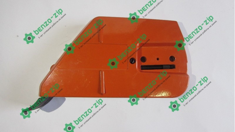 Закрывает вращающиеся части инструмента, тем самым защищая пильщика от возможных повреждений. Обеспечивает натяжение цепи при помощи двух винтов и фиксации шины гайками.